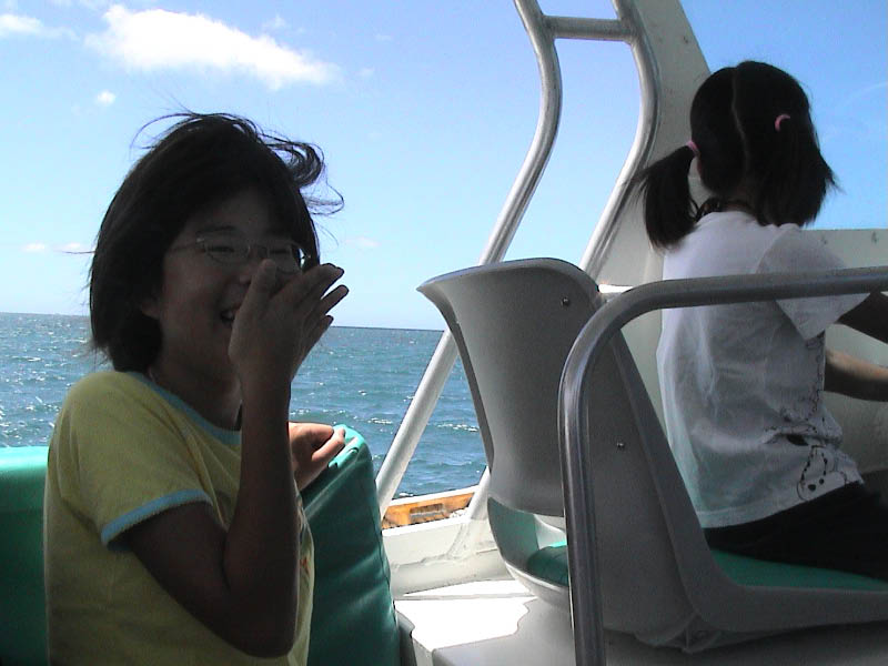 水上タクシーで、運転席横の席で満足げな直と大笑いの優。