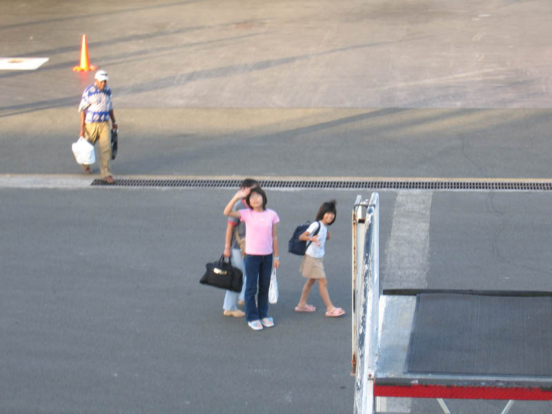 飛行機を降りて、到着ロビーに向かう家族。