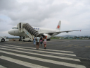2005/1/10 その後、父はバヌアツへの便の関係で、2泊しましたが、サイクロンの影響でずっと雨・・・。バヌアツへのエア・カランの飛行機。 |